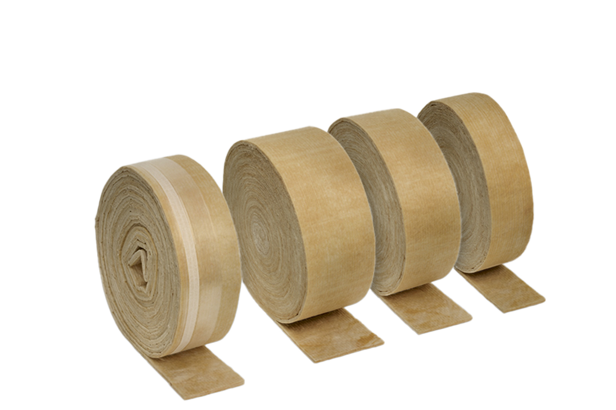 Gerollte Trittschalldämmfilzbänder aus Glaswolle, einseitig mit Glasvlies beschichtet. Auch mit Beschichtung und Überlappung aus PE mit Selbstklebeband erhältlich.